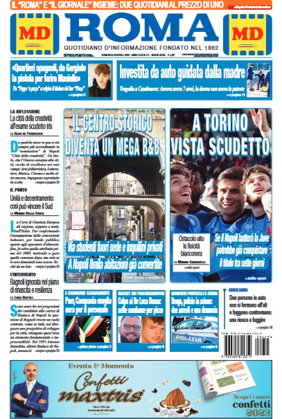 Il Roma, nell'edizione di oggi, dà spazio al Napoli, impegnato stasera allo Stadium contro la Juventus, in prima pagina: "A Torino vista scudetto". Il quotidiano napoletano scrive: "Se il Napoli batterà la Juve potrebbe già conquistare il titolo tra sette giorni. Ostacolo alto la fisicità bianconera".
