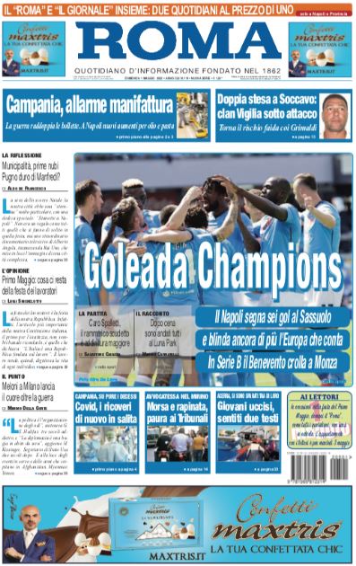 Il Napoli batte nettamente il Sassuolo e conquista quasi l'aritmetica qualificazione alla prossima Champions League. Agli azzurri, reduci dal riscatto contro la banda Dionisi, manca solo un punto. Il Roma oggi in edicola titola così in prima pagina: "Goleada Champions".