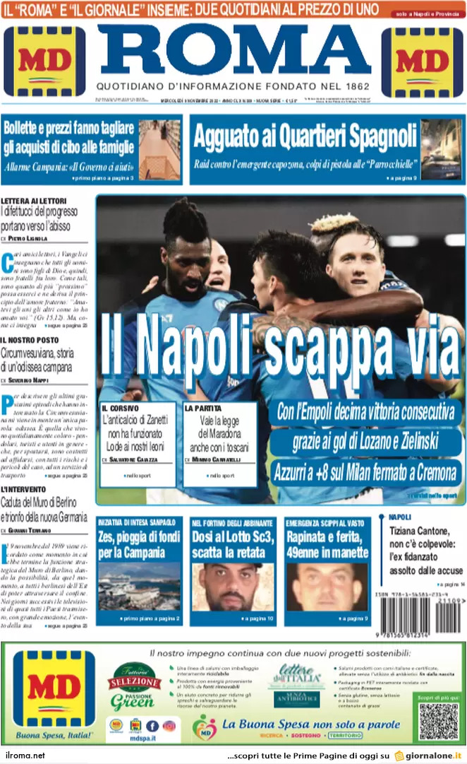"Il Napoli scappa via", si legge stamane in apertura su Il Roma. Con l'Empoli decima vittoria consecutiva per la squadra di Spalletti: a confezionarla le reti di Lozano e Zielinski.