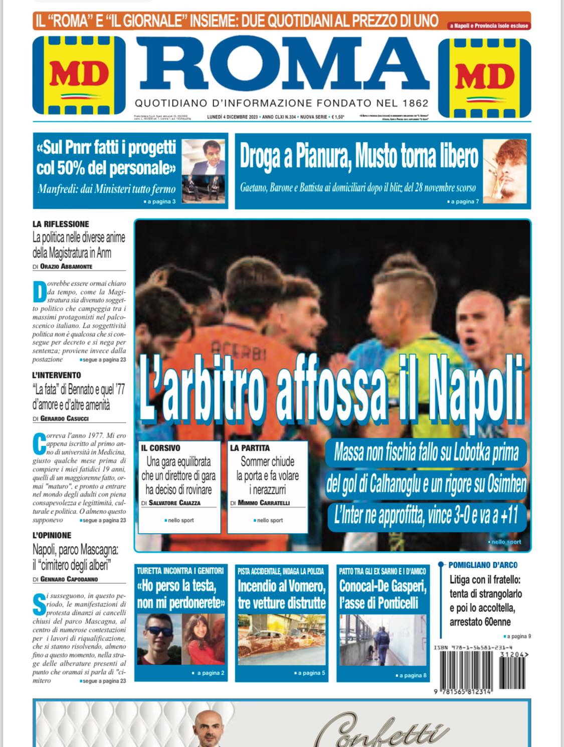 Nell'edizione odierna, Il Roma dedica la prima pagina al ko del Napoli contro l'Inter e l'arbitraggio di Massa che ha condizionato il big match della 14ª giornata di Serie A: "L'arbitro affossa il Napoli. Massa non fischia fallo su Lobotka prima del gol di Calhanoglu e un rigore su Osimhen. L'Inter ne approfitta, vince 3-0 e va a +11".