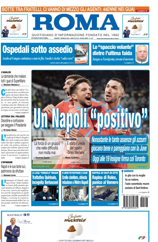 "Un Napoli positivo. Oggi Insigne firma col Toronto" si legge in prima pagina sull'edizione odierna del quotidiano Roma oggi in edicola. Gioco di parole in piena pandemia per il giornale che esalta gli azzurri dopo il pari di Torino.