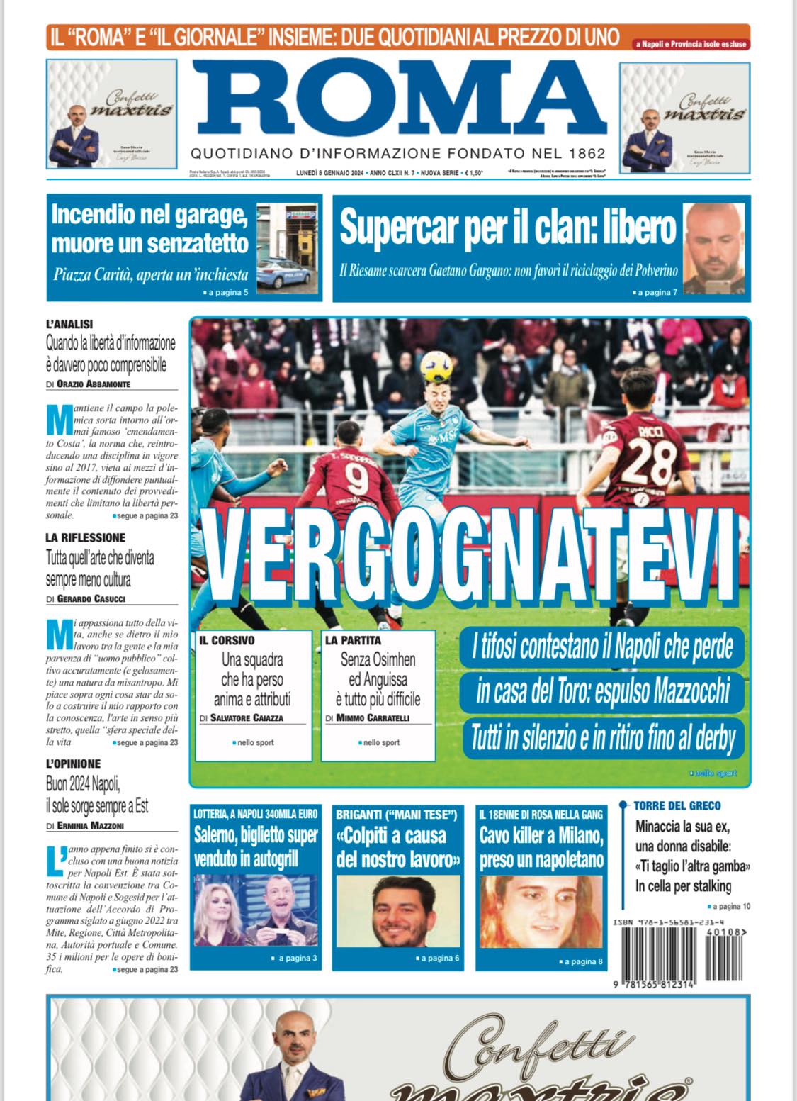 Nell'edizione di oggi, Il Roma apre in prima pagina con il tracollo de Napoli a Torino: "Vergognatevi. I tifosi contestano il Napoli che perde in casa del Toro: espulso Mazzocchi. Tutti in silenzio e in ritiro fino al derby".