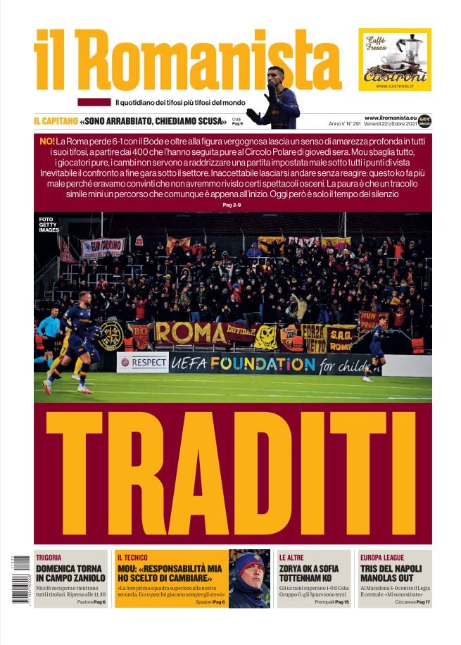 “Traditi! Una vergogna che può minare il percorso”, scrive così Il Romanista in apertura quest'oggi che critica aspramente il 6-1 della Roma contro il Bodo Glimt. "Inaccettabile lasciarsi andare senza reagire: questo ko fa più male perché eravamo convinti che non avremmo rivisto certi spettacoli osceni. La paura è che un tracollo simile mini un percorso che comunque è appena all’inizio. Oggi però è solo il tempo del silenzio. Mou sbaglia tutto, i giocatori pure, i cambi non servono a raddrizzare una partita impostata male sotto tutti i punti di vista Inevitabile il confronto a fine gara sotto il settore".