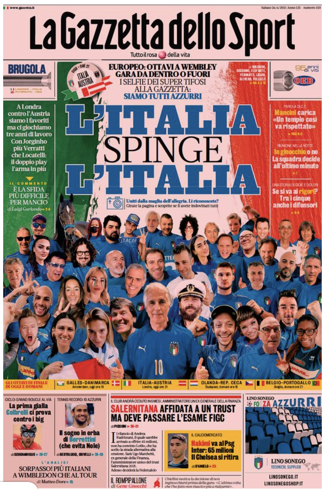"L'Italia spinge l'Italia" è il titolo con cui si apre l'odierna edizione de La Gazzetta dello Sport in edicola stamani. Il quotidiano ha raccolto dei selfie di molti personaggi famosi, mostrandoli poi nel taglio basso della propria prima pagina. A Londra contro l'Austria siamo i favoriti ma ci giochiamo tre anni di lavoro. Con Jorginho, più Verratti che Locatelli: il doppio play l'arma in più. E' la sfida più importante anche per Mancini che in conferenza ha detto: "Un tempio come quello di Wembley va rispettato".