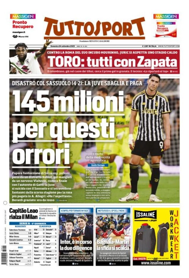 “145 milioni per questi orrori”. Titola così al centro l’edizione odierna di Tuttosport: "Disastro col Sassuolo (4-2): la Juve sbaglia e paga". In taglio alto il Torino: "Tutti con Zapata". In basso spazio alla vittoria del Milan ai danni del Verona: "Capitão Leao rialza il Milan".
