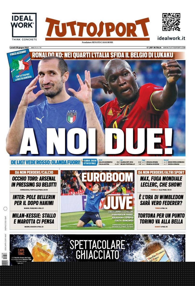 Nell'edizione di oggi, Tuttosport apre in prima pagina con la sfida dei quarti a Euro 2020 tra l'Italia e il Belgio: "A noi due! Ronaldo ko". Di spalla spazio al calciomercato: "Occhio Toro: Arsenal in pressing su Belotti. Inter: pole Bellerin per il dopo Hakimi. Milan-Kessie: stallo e Marotta ci pensa".