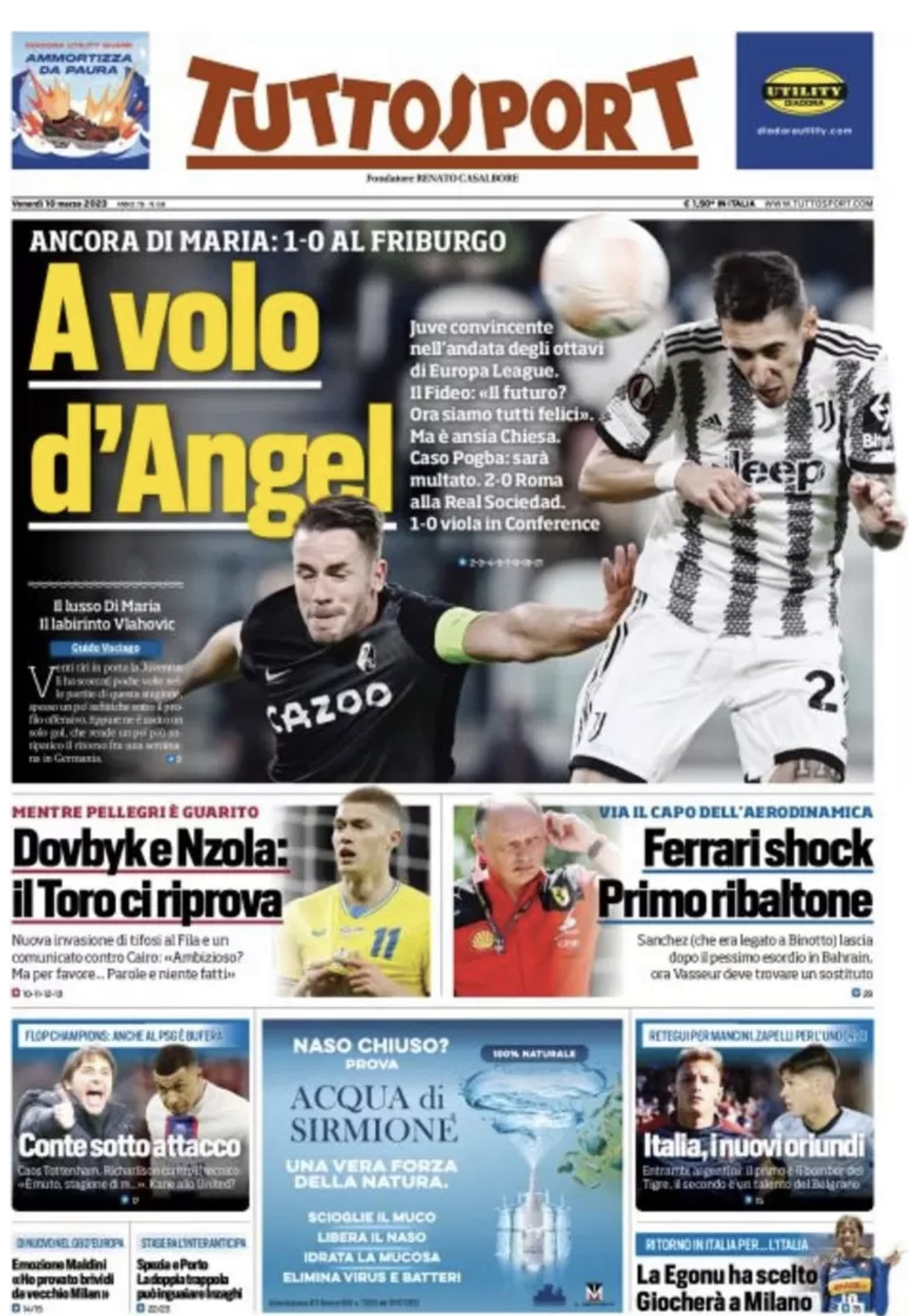 “A volo d’Angel”. Titola così al centro l’edizione odierna di Tuttosport. “Juve convincente nell’andata degli ottavi di Europa League. Ma è ansia Chiesa. Caso Pogba: sarà multato. 2-0 Roma alla Real Sociedad. 1-0 viola in Conference”. In basso spazio al Torino: “Dovbyk e Nzola: il Toro ci riprova”.