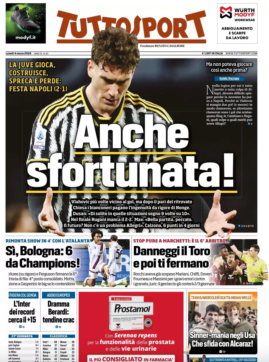 "Anche sfortunata!", titola così il quotidiano torinese Tuttosport. molto vicino alle vicende di casa Juventus, per raccontare della sconfitta dei bianconeri: "La Juve gioca, costruisce e spreca: festa Napoli 2-1" in taglio basso il Bologna da Champions e poi i presunti torti arbitrali al Torino. Di seguito la prima pagina integrale.