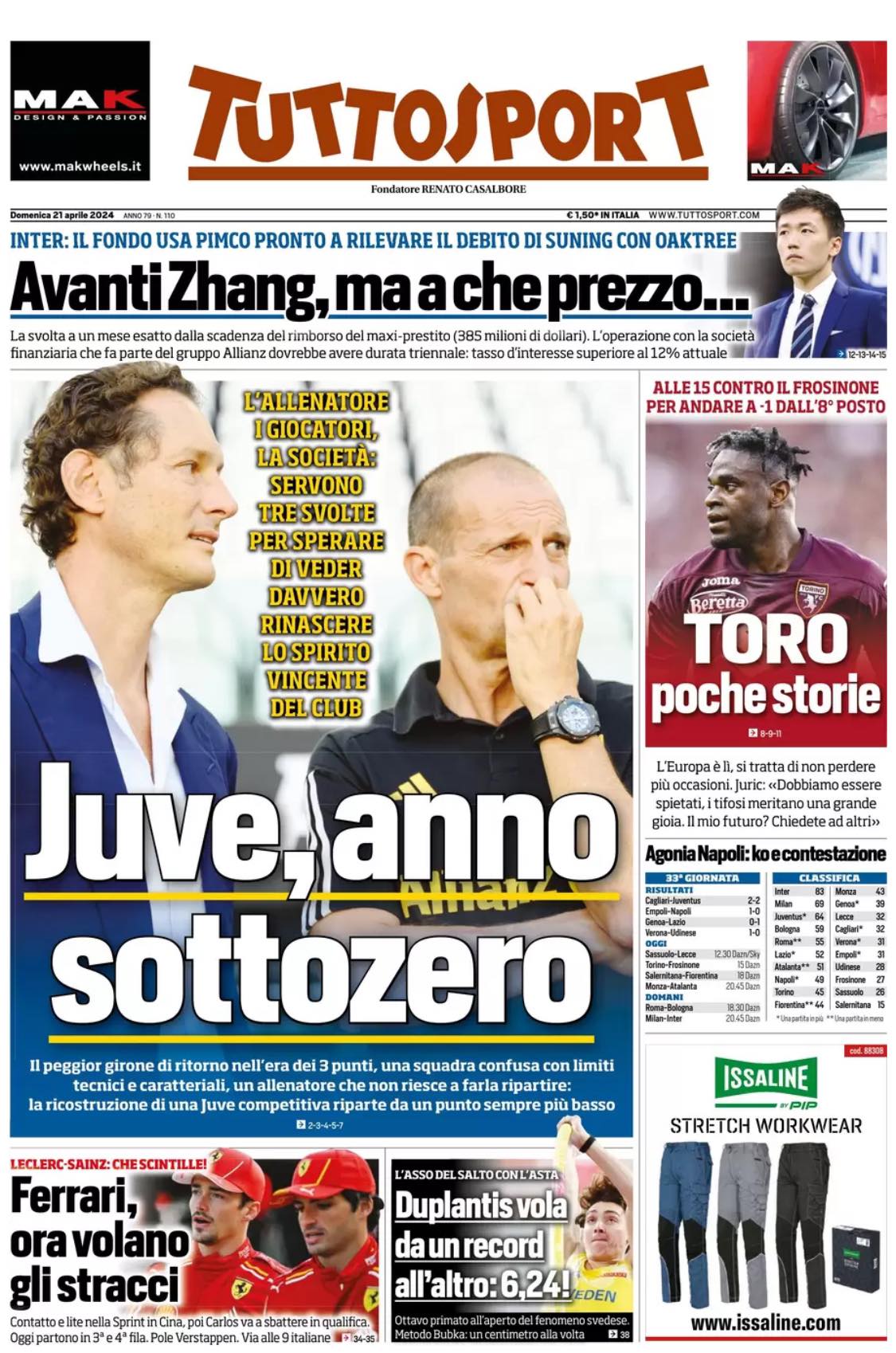 Nell'edizione odierna, Tuttosport dedica spazio in prima pagina all'occasione dei granata per accorciare sul Napoli per un posto in Europa: "Toro poche storie". Il commento in alto al box: "Alle 15 contro il Frosinone per andare a -1 dall'8º posto". L'apertura è riservata alla situazione in casa bianconera: "Juve, anno sottozero". Il sommario: "L'allenatore, i giocatori, la società: servono tre svolte per sperare di veder davvero rinascere lo spirito vincente del club". In spalla un box è riservato alla sconfitta degli azzurri contro l'Empoli: "Agonia Napoli, ko e contestazione".
