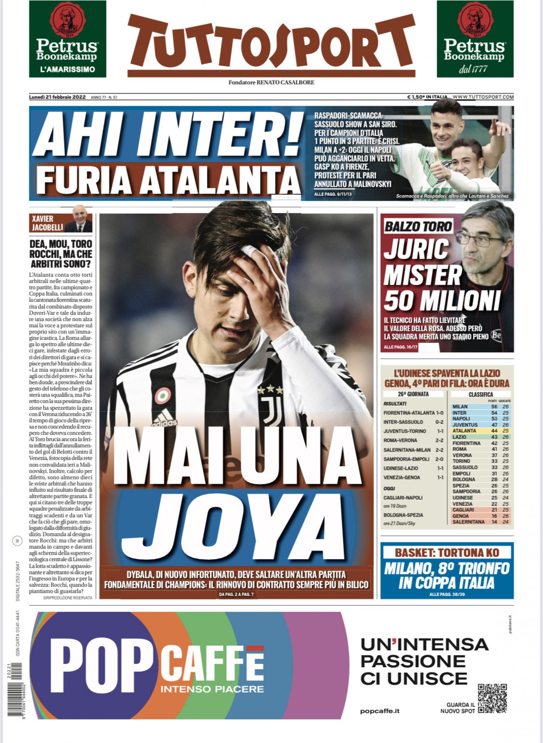 “Ahi Inter! Furia Atalanta”, è questa l’apertura di Tuttosport che apre con le sconfitte di Atalanta e Inter. "Raspadori-Scamacca: Sassuolo show a San Siro. Per i campioni d'Italia 1 punto in 3 partite: è crisi. Milan a +2, oggi il Napoli può agganciarlo in vetta. Gasp ko a Firenze. Proteste per il pari annullato a Malinovskyi". Spazio anche alla Juventus in riferimento all'infortunio rimediato da Dybala nel derby contro il Torino: "Mai una Joya"