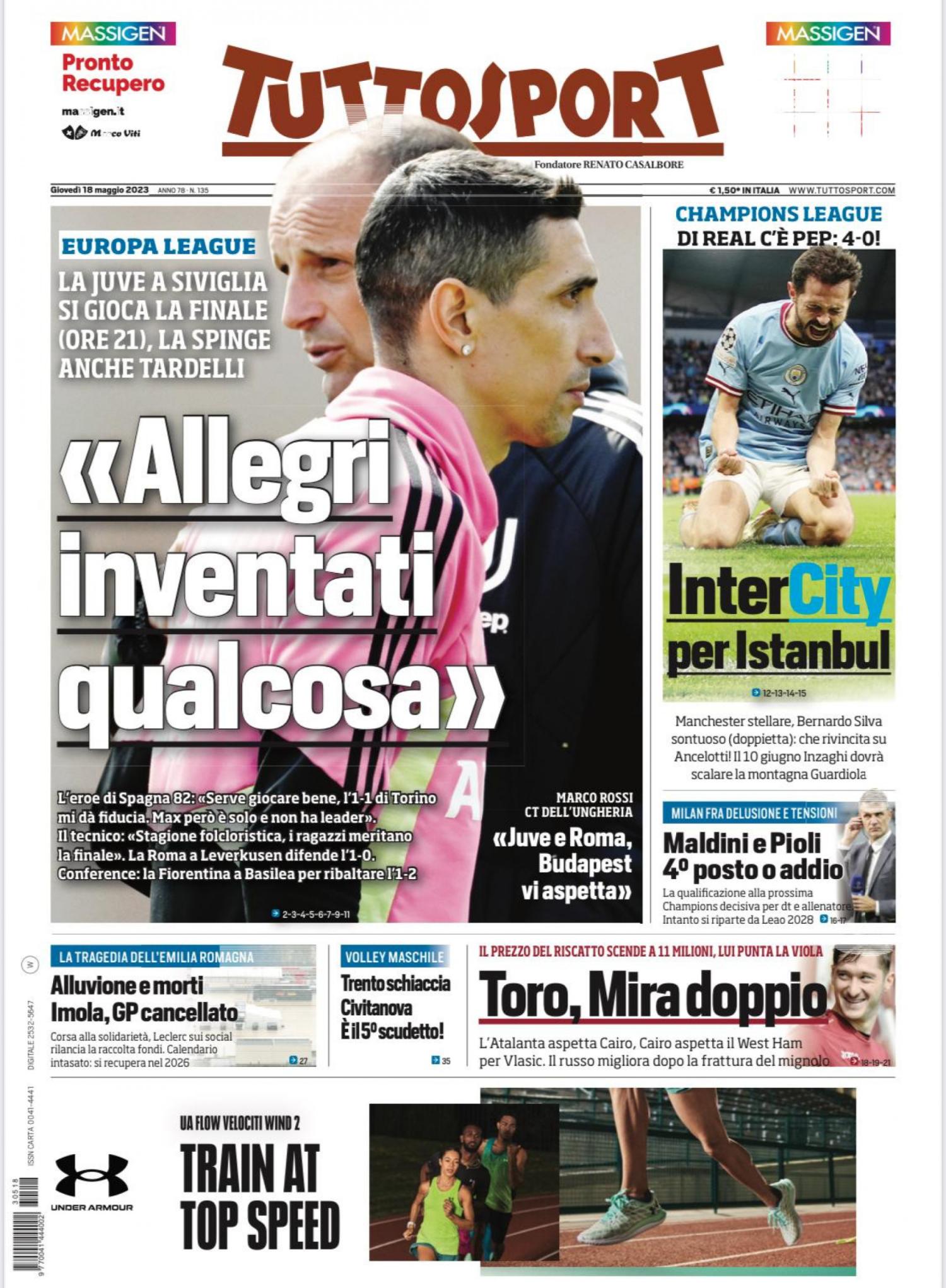"Allegri inventati qualcosa", apre così in prima pagina nell'edizione di oggi Tuttosport in riferimento alla semifinale di ritorno di Europa League tra Juventus e Siviglia. Di spalla spazio alla finale di Champions League: "InterCity per Istanbul". Più in basso spazio anche al Milan: "Maldini e Pioli, quarto posto o addio". In taglio basso il mercato del Torino con il futuro di Miranchuk: "Toro, Mira doppio".