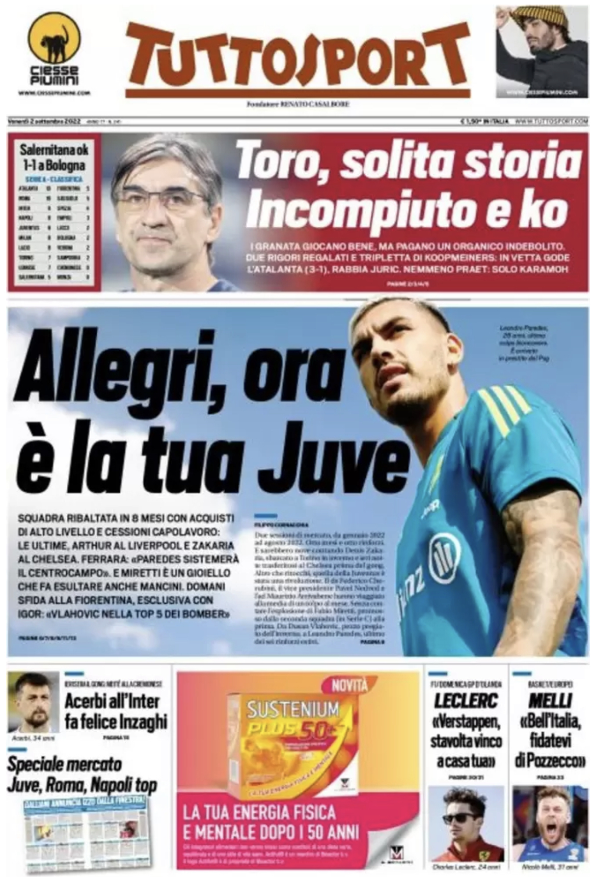 “Allegri, ora è la tua Juve”. E’ questa l’apertura di Tuttosport che apre con l’ultimo innesto di Paredes in casa bianconera. In taglio alto spazio al ko del Torino contro l'Atalanta: "Toro, solita storia. Incompiuto e ko". In taglio basso l'Inter: "Acerbi all'Inter fa felice Inzaghi".
