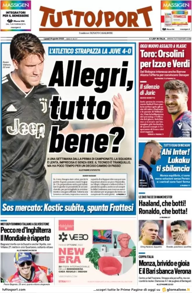 Tuttosport, nell'edizione odierna, apre in priama pagina con il pesante ko subito dalla Juve in amichevole: "Allegri, tutto bene? L'Atletico strapazza la Juve 4-0". A centro pagina ancora spazio alla Juve: "Sos mercato: Kostic subito, spunta Frattesi". Di spalla il mercato del Torino: "Toro: Orsolini per Izzo e Verdi".