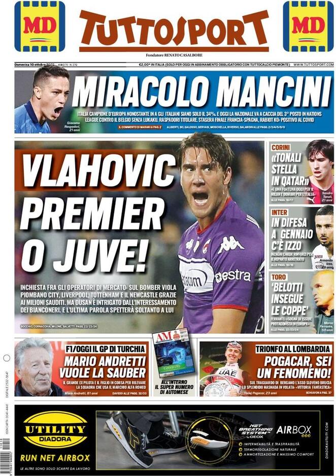 Tanto mercato nell'edizione odierna di Tuttosport, quantomeno in prima pagina. "Vlahovic, Premier o Juve", il titolo d'apertura del quotidiano piemontese, riportando un'inchiesta sul tema fra vari operatori di mercato. Per l'Inter, invece, c'è l'idea Armando Izzo per gennaio: "Inzaghi chiede rinforzi per il reparto arretrato".