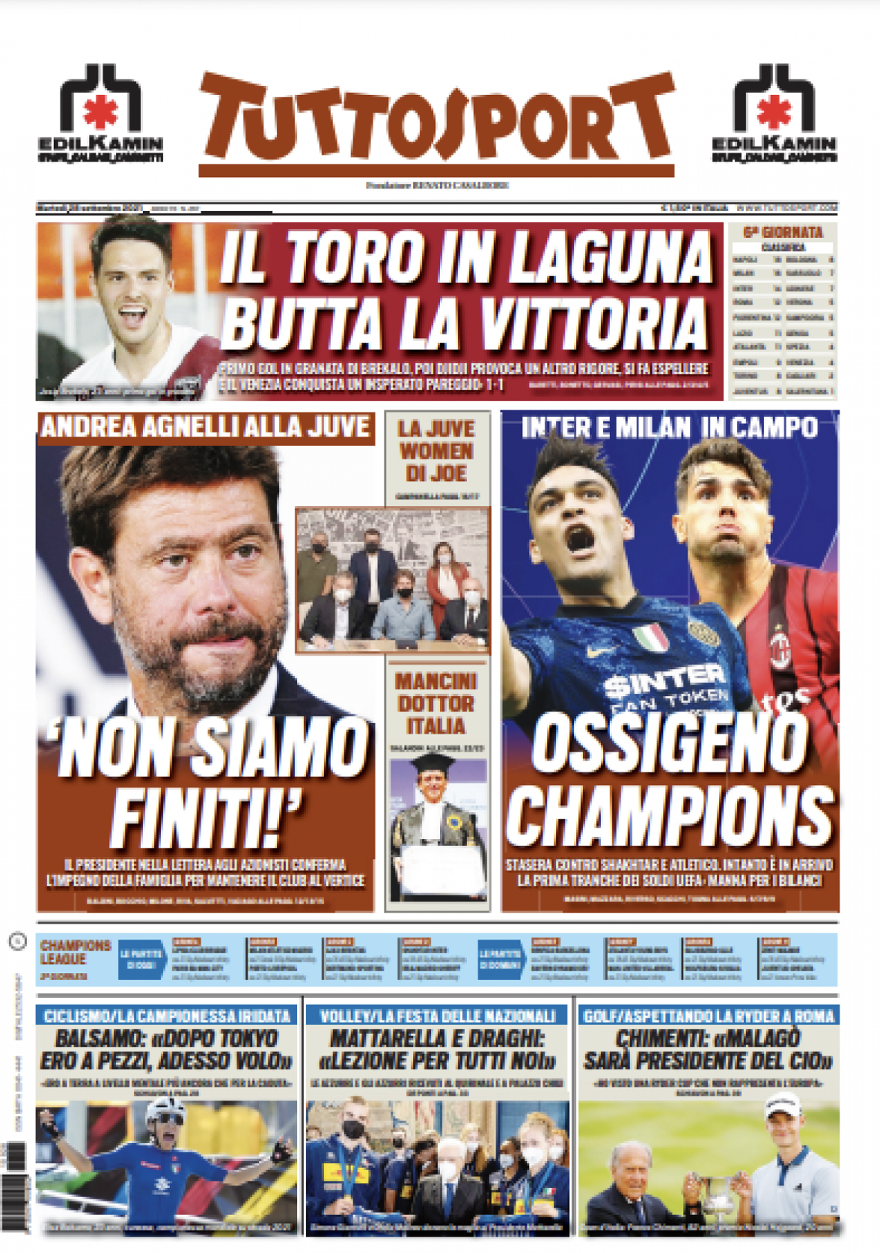 Doppia apertura di Tuttosport nella prima pagina odierna. Da una parte spazio alla Juventus, con le parole del presidente Andrea Agnelli: "Non siamo finiti!". Dall'altra spazio alla Champions League, con l'impegno di Milan e Inter: "Ossigeno Champions". In taglio alto, il pareggio del Torino contro il Venezia nel posticipo della sesta giornata di Serie A, dal titolo: "Il Toro in Laguna butta la vittoria"