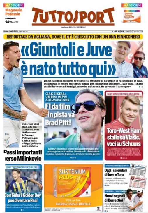 Tuttosport dedica l'apertura in prima pagina, come di consueto, alla Juventus e a Cristiano Giuntoli, con un reportage da Agliana, dov'è cresciuto l'ex ds azzurro "con dna bianconero", scrivono. Di spalla il mercato bianconero: "Passi importanti verso Milinkovic".