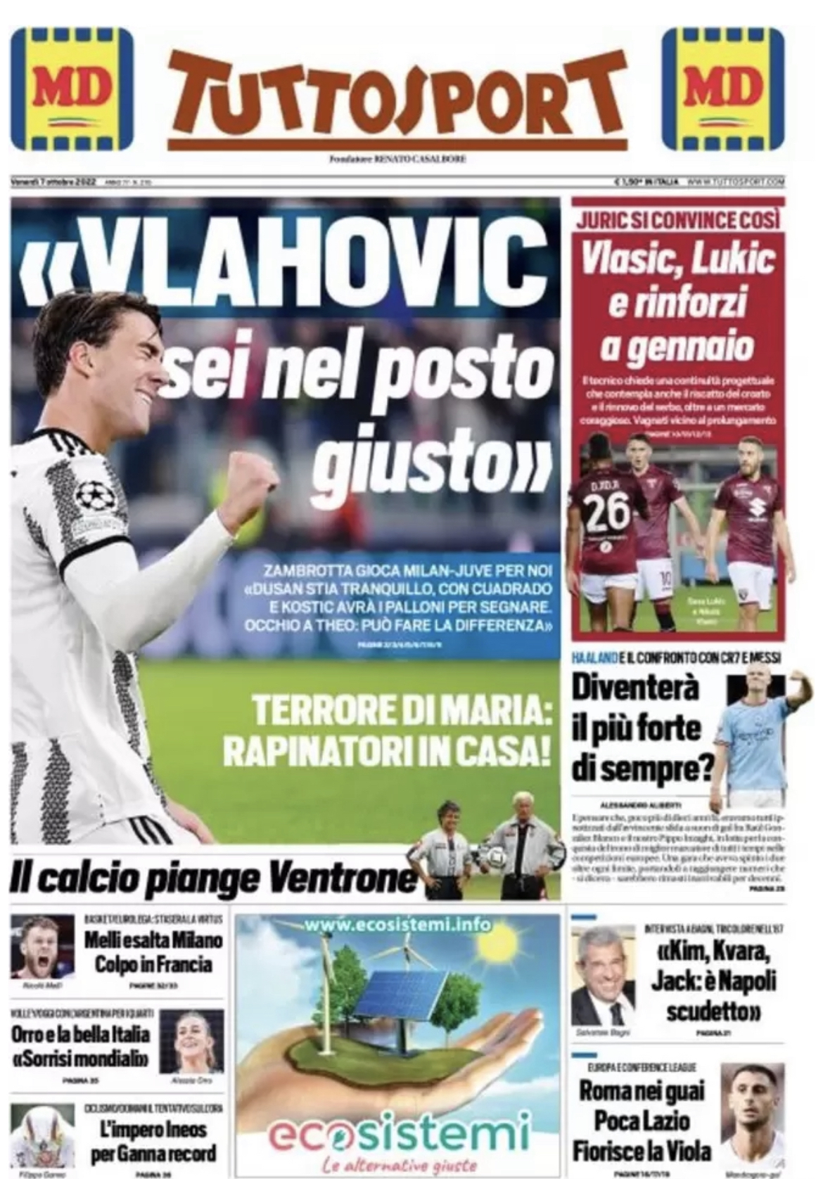 “Kim, Kvara, Jack: è Napoli scudetto”. E’ questa l’apertura di Tuttosport che apre con l’intervista a Salvatore Bagni. Al centro ampio spazio all'intervista a Gianluca Zambrotta in vista di Milan-Juve. Di spalla il Torino: "Vlasic, Lukic e il mercato di gennaio". In taglio basso e di spalla i risultati delle italiane in Europa e Conference League.