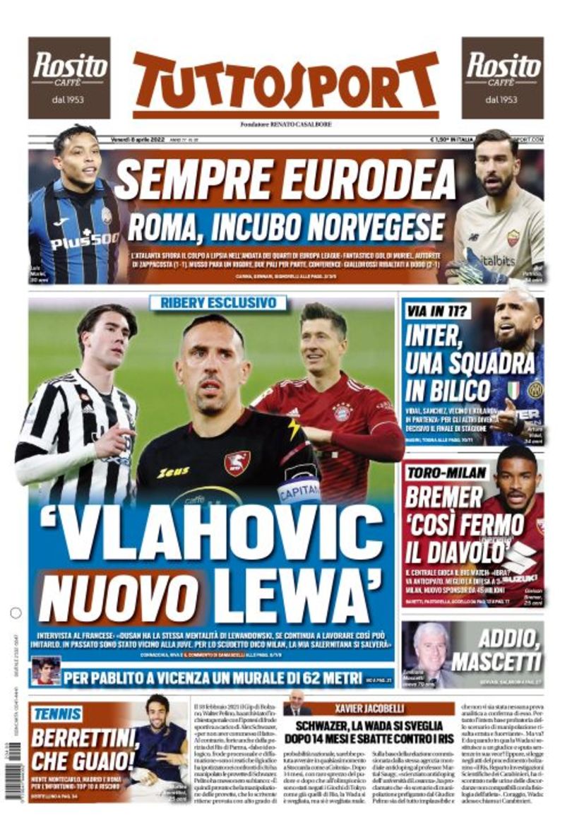 “Vlahovic nuovo Lewa”, è questa l’apertura di Tuttosport che apre con l’intervista a Franck Ribery. In taglio alto spazio alle italiane in Europa in taglio alto: "Sempre Eurodea. Roma, incubo norvegese". E in vista di Torino-Milan: "Bremer 'Così fermo il Diavolo'".