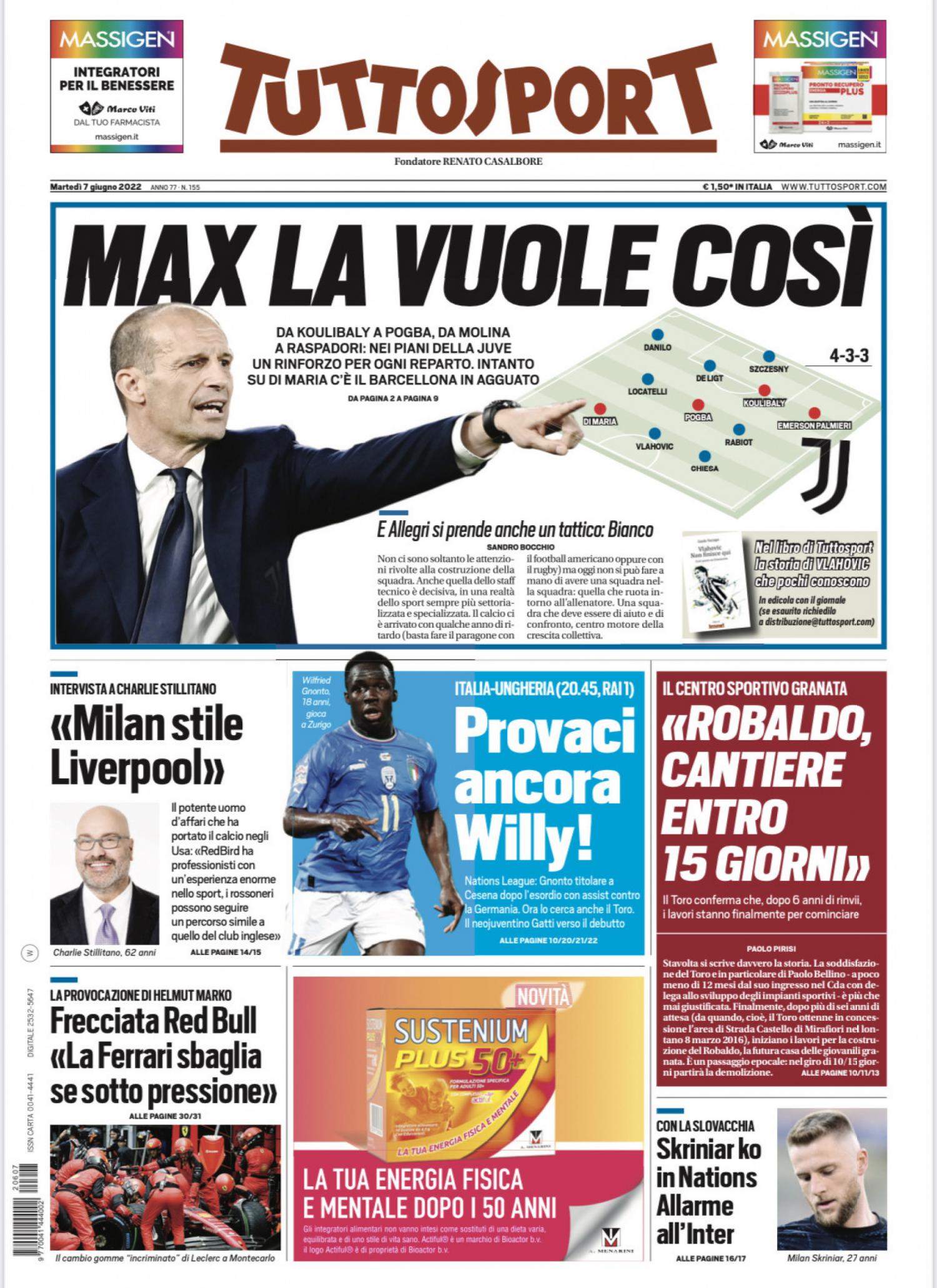 “Max la vuole così”. E’ questa l’apertura di Tuttosport che apre con la Juventus: "Da Koulibaly a Pogba, da Molina a Raspadori: nei piani della Juve un rinforzo per ogni reparto. Intanto su Di Maria c'è il Barcellona in agguato". Spazio anche alla Nations League: "Provaci ancora Willy". Di spalla c'è il Torino: "Robaldo, cantiere entro 15 giorni". In taglio basso l'infortunio del difensore nerazzurro con la propria nazionale: "Skriniar ko in Nations. Allarme Inter".