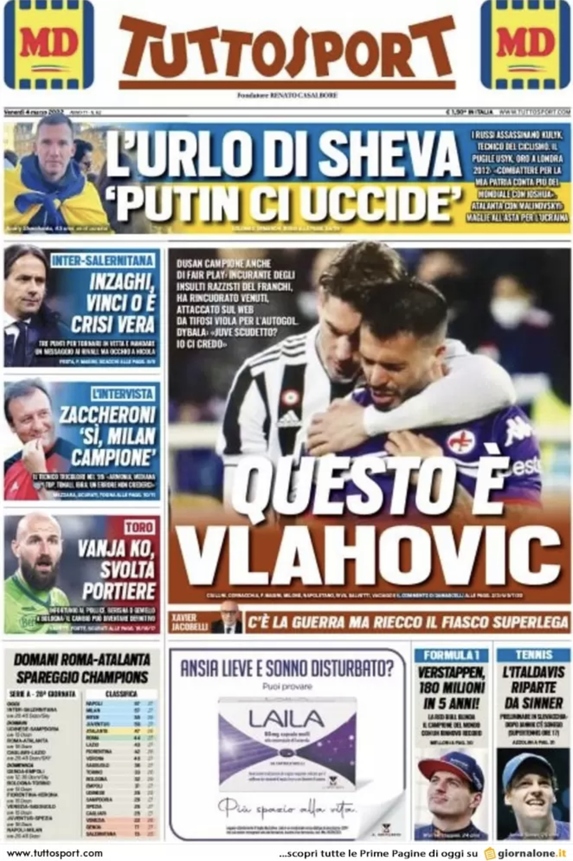 “Questo è Vlahovic”, è questa l’apertura di Tuttosport che apre con la Juventus e il centravanti serbo. "Dusan campione anche di Fair Play: incurante degli insulti razzisti del Franchi, ha rincuorato Venuti , attaccato sul web da tifosi viola per l'autogol". In taglio alto si parla della Guerra in Ucraina con l'appello di Shevchenko. Di spalla l'Inter che se la vedrà questa sera contro la Salernitana, l'intervista a Zaccheroni e il Torino alle prese con l'infortunio di Milinkovic-Savic.