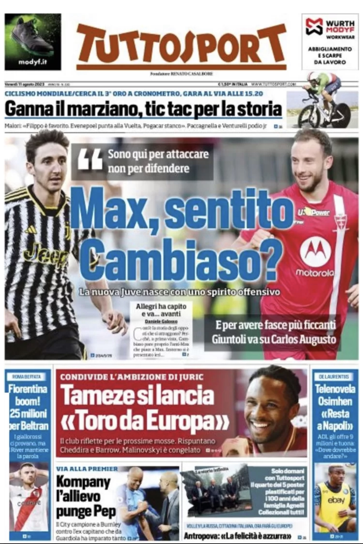 “Telenovela Osimhen: ‘Resta a Napoli’”. Titola così di spalla l’edizione odierna di Tuttosport: "ADL gli offre 9 milioni e tuona: 'Dove dovrebbe andare?'". Al centro ampio spazio alla Juventus e alle parole di Cambiaso: "Max, sentito Cambiaso?". In basso il Torino e le prime dichiarazioni di Tameze.