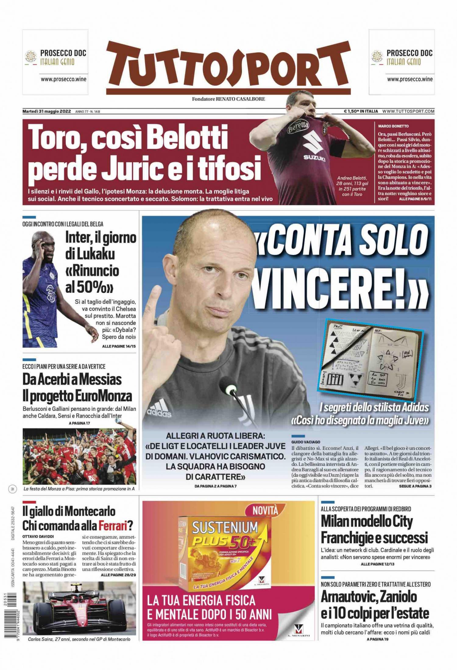 "Conta solo vincere!”, è questa l’apertura di Tuttosport che apre con una citazione dell'ultima intervista di Massimiliano Allegri rilasciata a DAZN. In taglio alto spazio al Torino: "Toro, così Belotti perde Juric e i tifosi". Di spalla l'Inter che rivuole Lukaku: "Oggi incontro con i legali del belga. Sì al taglio dell'ingaggio, va convinto il Chelsea sul prestito".