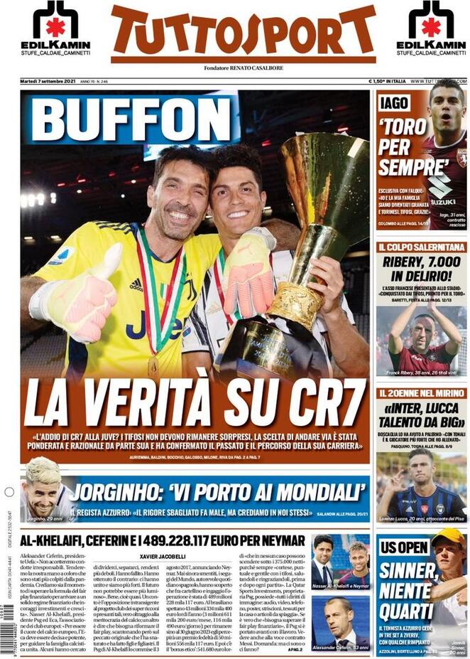 Tuttosport dedica l’apertura alle parole di Gigi Buffon: "L'addio di CR7 alla Juve? I tifosi non devono rimanere sorpresi. La scelta di andare via è stata ponderata e razionale da parte sua e ha confermato il passato e il percorso della sua carriera". Al centro si parla di Italia e di Jorginho: "Vi porto io ai mondiali". Sulla destra il colpo Ribery da parte della Salernitana e il tennis con Sinner che viene eliminato agli US Open.