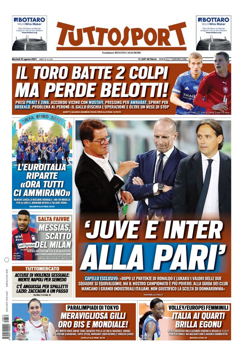 "Juve e Inter alla pari", l'edizione odierna di Tuttosport dedica l'apertura all'intervista esclusiva di Fabio Capello. In taglio alto spazio al mercato del Torino: "Il Toro batte 2 colpi ma perde Belotti. Presi Praet e Zima. Vicino con Mustafi, pressing per Amrabat, sprint per Brekalo. Problema al perone: il Gallo rischia l'operazione e oltre un mese di stop". Sulla sinistra il Milan: "Salta Faivre. Messias, scatto del Milan".