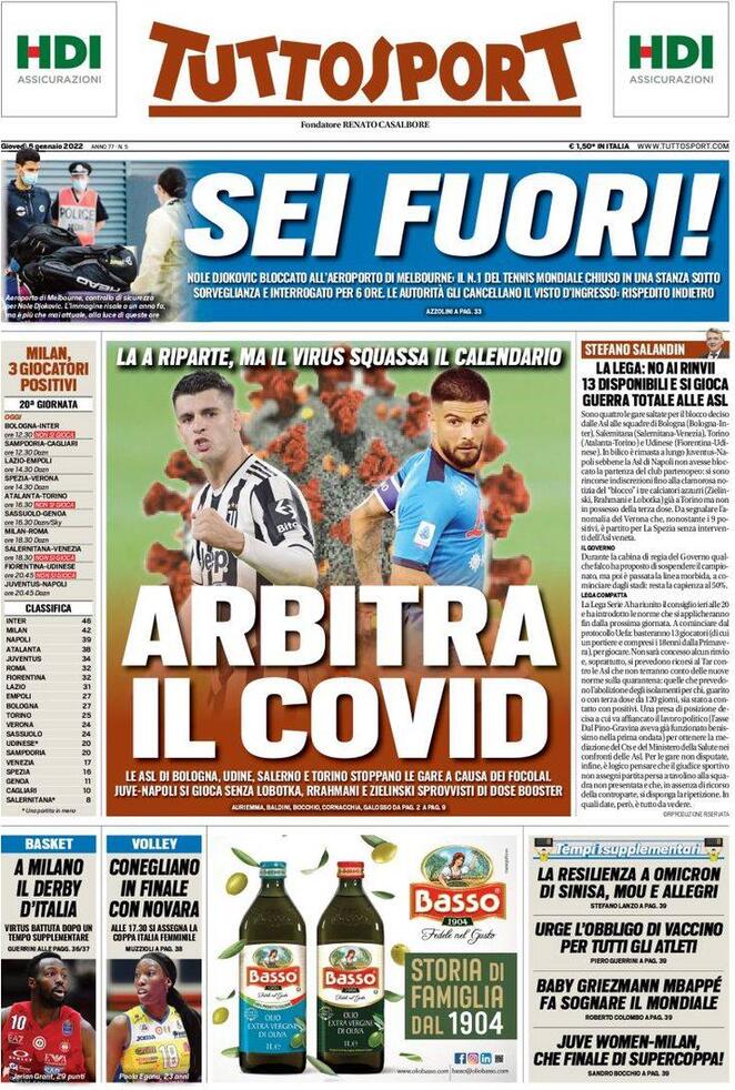 “Arbitra il Covid”, è questa l’apertura di Tuttosport che apre dedicando un ampio spazio ai tanti casi di positività in Serie A. "La A riparte ma il virus squassa il campionato". In taglio alto si parla di Novak Djokovic: "Sei fuori. Nole Djokovic bloccato all'aeroporto di Melbourne: il n.1 del tennis mondiale chiuso in una stanza sotto sorveglianza e interrogato per 6 ore. Le autorità gli cancellano il visto d'ingresso: rispedito indietro".