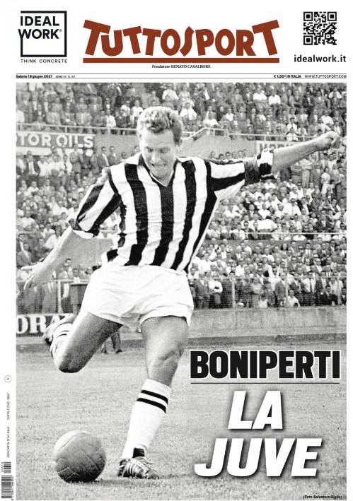 Tuttosport, nell'edizione di oggi, dedica completamente la sua prima pagina a Giampiero Boniperti, ex capitano, bandiera e presidente della Juventus deceduto all'età di 92 anni.