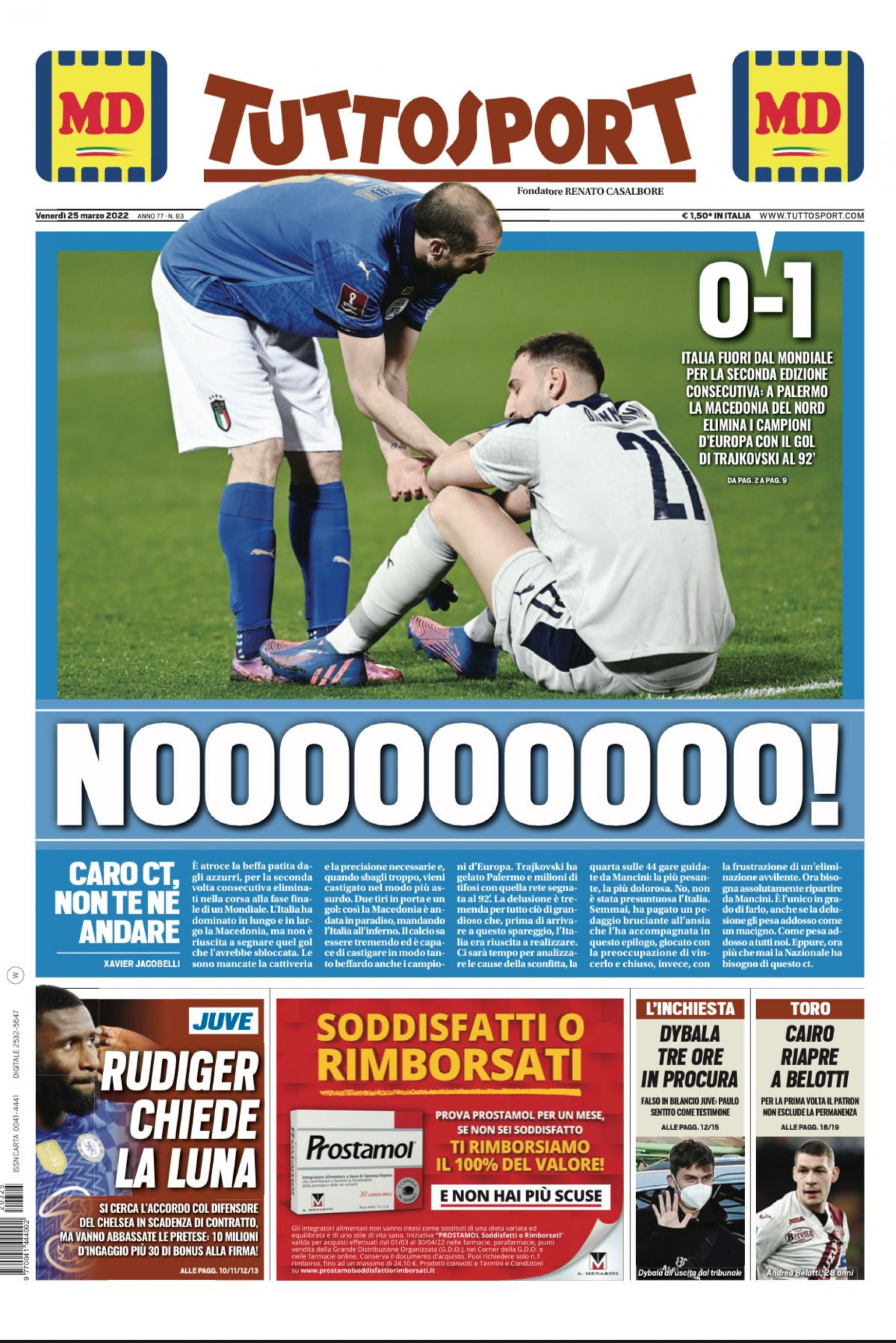Tuttosport apre in prima pagina con l'incredibile ko dell'Italia che è valso l'eliminazione dai Mondiali: "Italia fuori dal Mondiale per la seconda volta consecutiva: a Palermo la Macedonia del Nord elimina i campioni d'Europa con il gol di Trajkovski al 92'". Al centro anche il fondo del direttore Xavier Jacobelli: "Caro CT, non te ne andare". Spazio anche al caso Juventus e al falso bilancio: "Dybala, tre ore in procura", e infine anche alla squadra granata: "Carino riapre a Belotti".