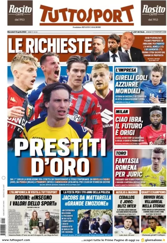 Nell'edizione di oggi Tuttosport apre in prima pagina con il caso plusvalenze: "Le richieste. Pesanti proposte di inibizione per Paratici (16 mesi), Agnelli (12) e De Laurentiis (11)". A centro pagina spazio al cambio di regolamento FIFA sui prestiti: "Prestiti d'oro". Di spalla il mercato del Milan con un possibile avvicendamento in attacco: "Ciao Ibra, il futuro è Origi".