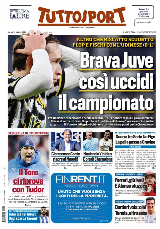 Tuttosport, nell'edizione di oggi, apre in prima pagina dedicando spazio al futuro della panchina azzurra: "Clamoroso: Conte riapre al Napoli!". Al centro, spazio alla sconfitta della Juventus: "Brava Juve: così uccidi il campionato". In taglio basso, spazio al mercato nerazzurro: "Inter già nel futuro: ieri visite mediche per Zielinski. Oggi sbarca Taremi".