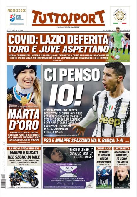 "Covid: Lazio deferita, Toro e Juve Aspettano". Titola così in prima pagina nell'edizione di oggi Tuttosport. "Rinvio a giudizio per la vittoria sui granata e per il pari con i bianconeri, Per Lotito e i medici si parla di responsabilità diretta". A centro pagina spazio all'impegno della Juventus in Champions League contro il Porto: "Ci penso io! Ronaldo sente aria di casa e carica i compagni".