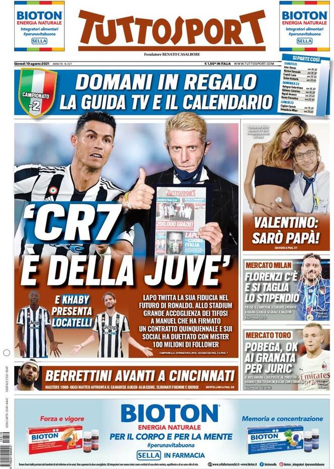 "CR7 è della Juve", titola così in prima pagina Tuttosport, nell'edizione di oggi. "Lapo twitta la sua fiducia nel futuro di Ronaldo". Di spalla spazio al mercato di Milan e Torino: "Florenzi c'é e si taglia lo stipendio". "Pobega, ok ai granata per Juric". Più in alto l'annuncio di Valentino Rossi: "Sarò papà!".