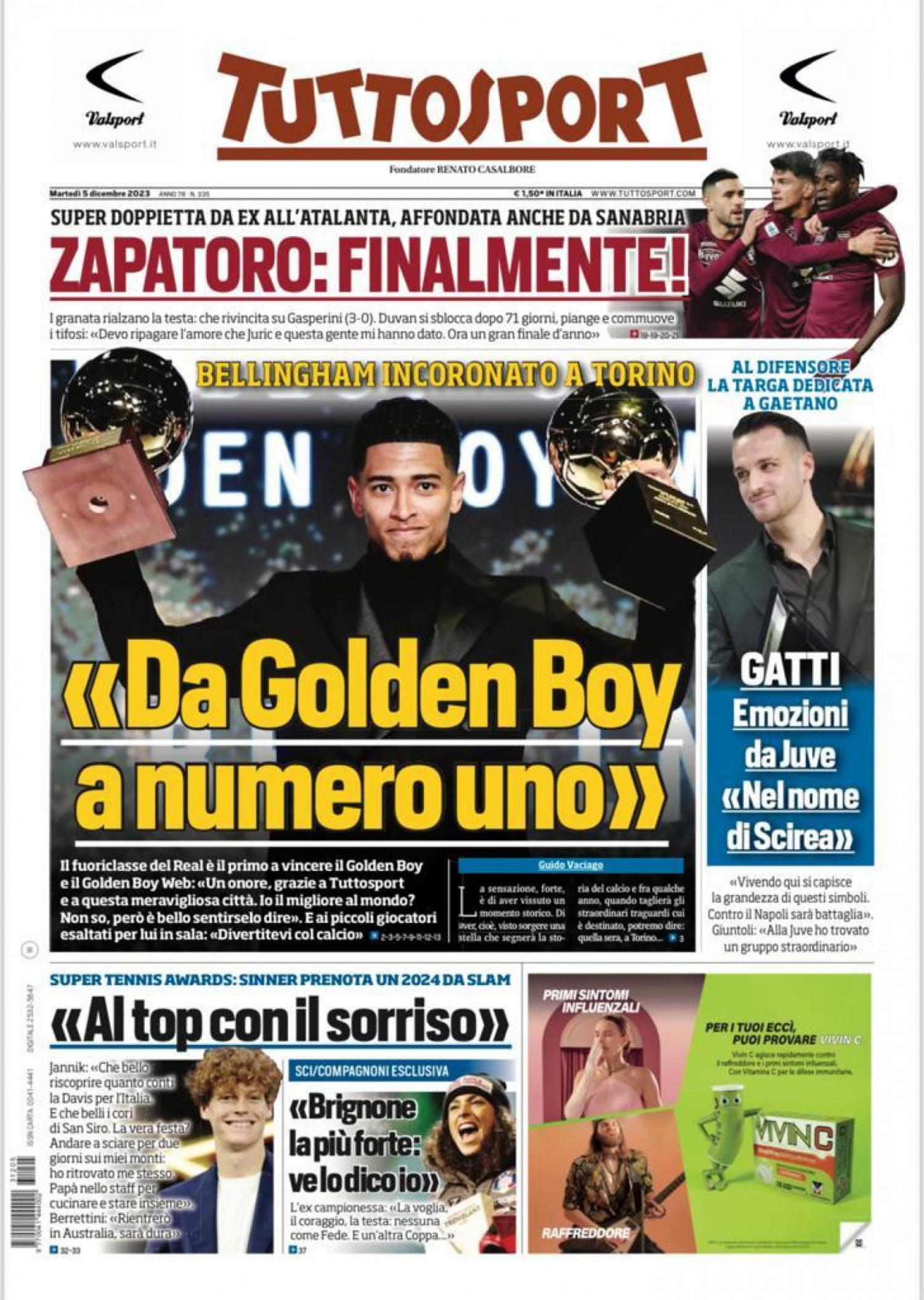 Tuttosport, nell'edizione di oggi, apre in prima pagina con il premio vinto da Jude Bellingham a Torino: "Da Golden Boy a numero uno". Di spalla il premio fair play vinto dallo juventino Gatti: "Emozioni da Juve: 'Nel nome di Scirea'". In taglio basso spazio anche alla vittoria per 3-0 del Torino contro l'Atalanta: "Zapatoro: finalmente!".