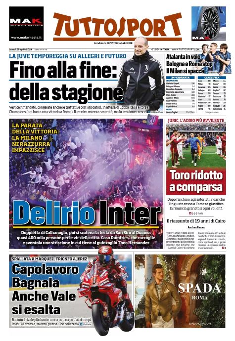 "Delirio Inter", titola quest'oggi il quotidiano torinese Tuttosport facendo riferimento ai festeggiamenti dei nerazzurri per la conquista del ventesimo scudetto. Il sommario: "La parata della vittoria: la Milano nerazzurra impazzisce". Un box è riservato alla gara del Torino proprio contro l'Inter, con i granata che hanno perso 2-0 rimanendo in dieci da inizio secondo tempo, per l'espulsione di Tameze: "Toro ridotto a comparsa". In taglio alto spazio anche alla situazione tra la Juventus e Max Allegri: "Fino alla fine: della stagione".