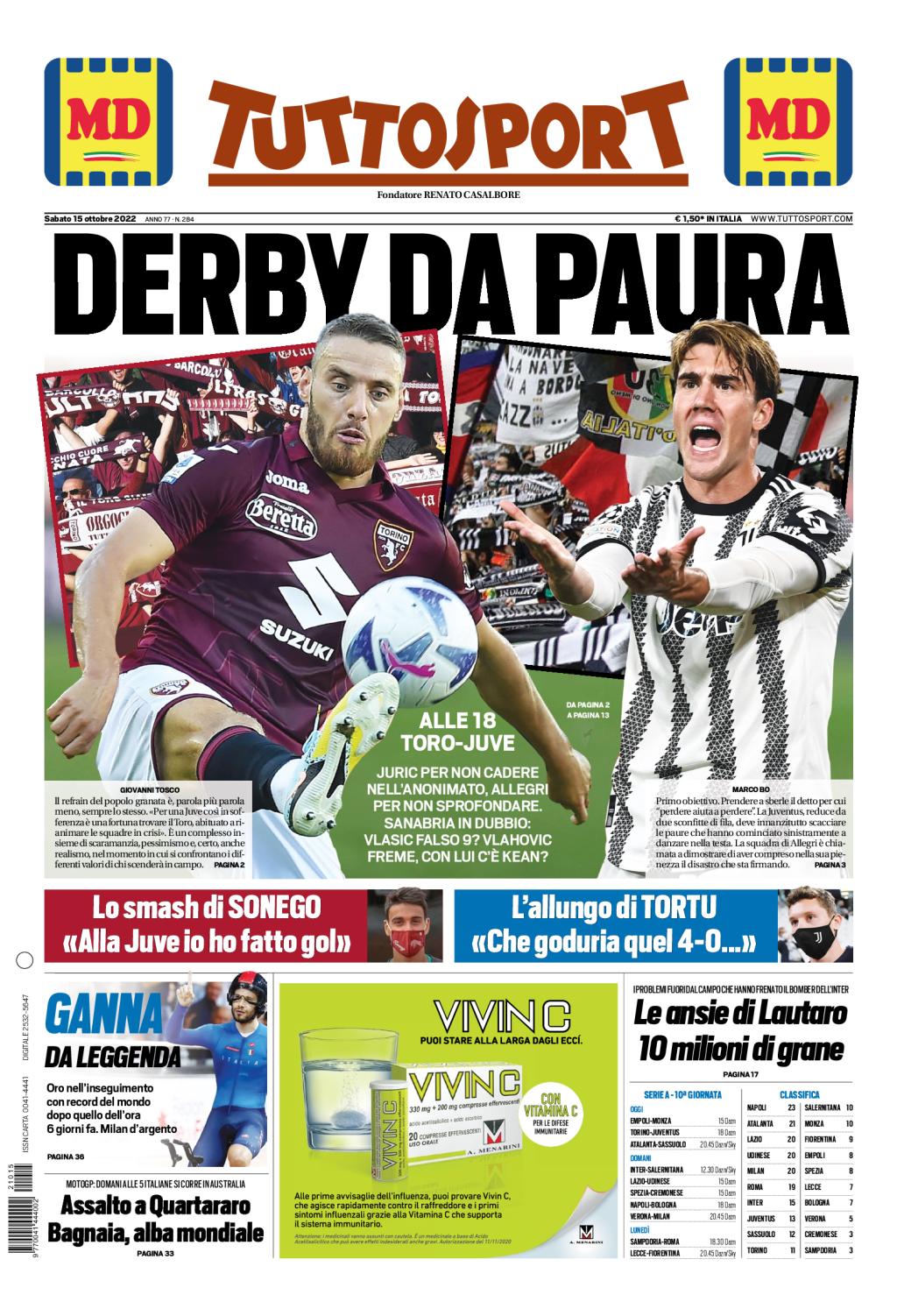 Ampio spazio al capitolo derby sulla prima pagina odierna di Tuttosport. Alle 18:00 la sfida tra le due rivali, Torino e Juventus, gara importantissima per il futuro di entrambi i tecnici. Juric dovrà giocarsi il tutto per tutto per non rischiare di cadere nell'anonimato, Allegri per non sprofondare. "Derby da paura" titola a riguardo il quotidiano.