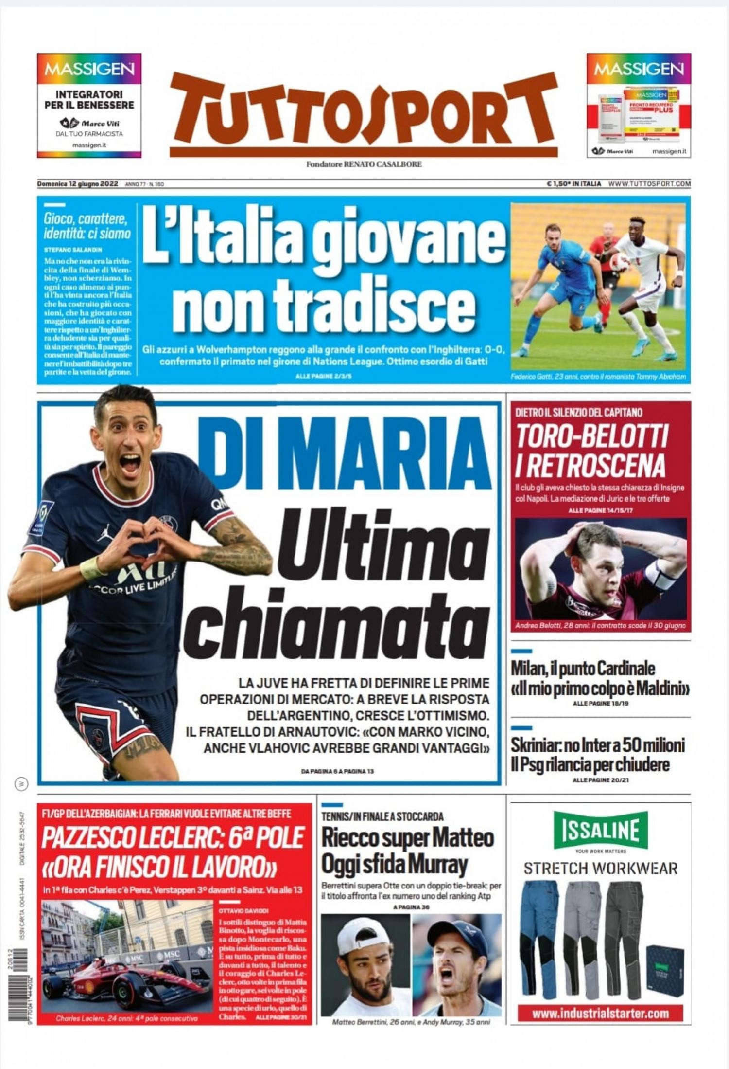 "Di Maria, ultima chiamata", titola così in prima pagina Tuttosport nell'edizione di oggi. La Juve ha fretta di definire le prime operazioni di mercato: a breve la risposta dell'argentino, cresce l'ottimismo. In taglio alto spazio alla Nazionale che pareggia con l'Inghilterra in Nations League: "L'Italia giovane non tradisce". Di spalla il caso Belotti, con l'attaccante che non ha ancora rinnovato: "Toro-Belotti, i retroscena".