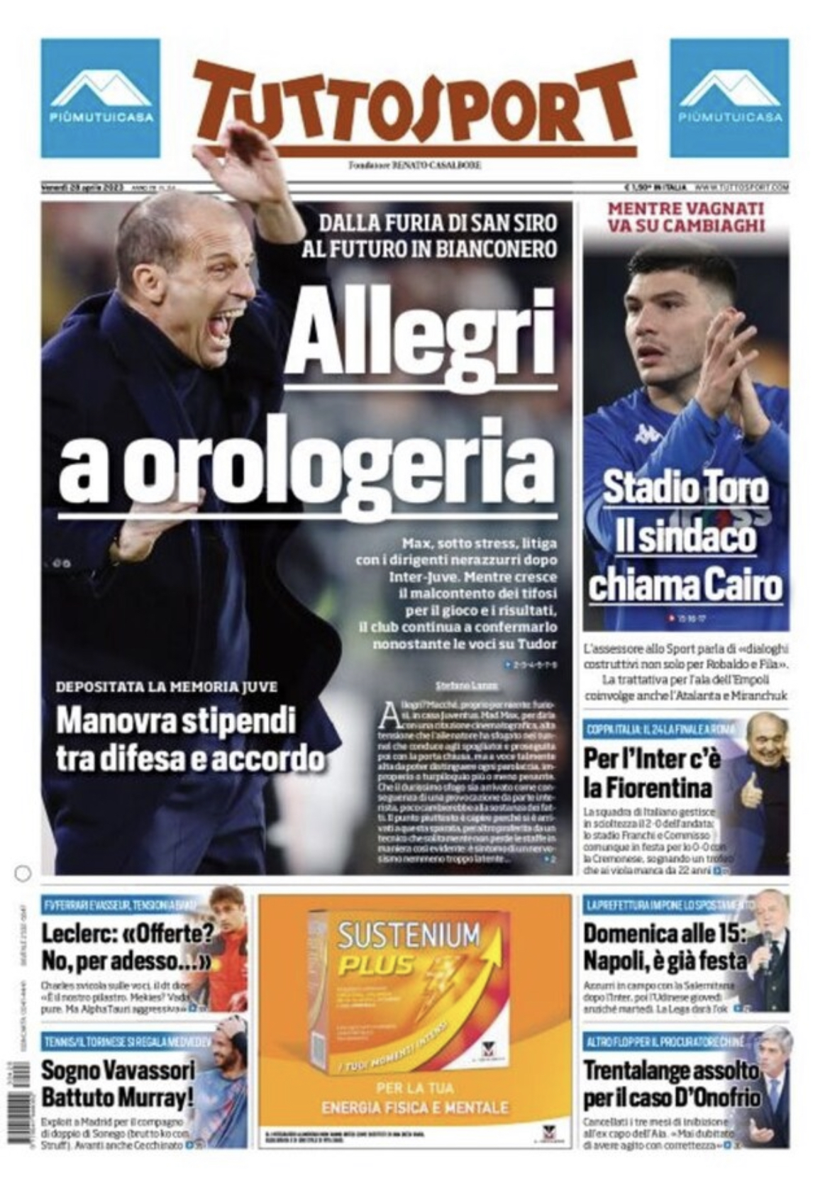 “Domenica alle 15: Napoli, è già festa”. Titola così in basso l’edizione odierna di Tuttosport. "Azzurri in campo con la Salernitana dopo l'Inter, poi l'Udinese giovedì anzichè martedì. La Lega darà l'ok". Al centro ampio spazio alle vicende di casa Juventus: "Allegri a orologeria. Dalla furia di San Siro al futuro in bianconero". Di spalla la Coppa Italia, con l'Inter che trova la Fiorentina in finale.