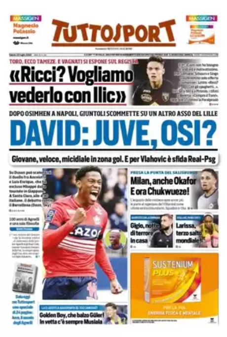 "David: Juve, osi? Dopo Osimhen a Napoli, Giuntoli scommette su un altro asso del Lille". Lo si legge sull'edizione odierna del quotidiano Tuttosport.