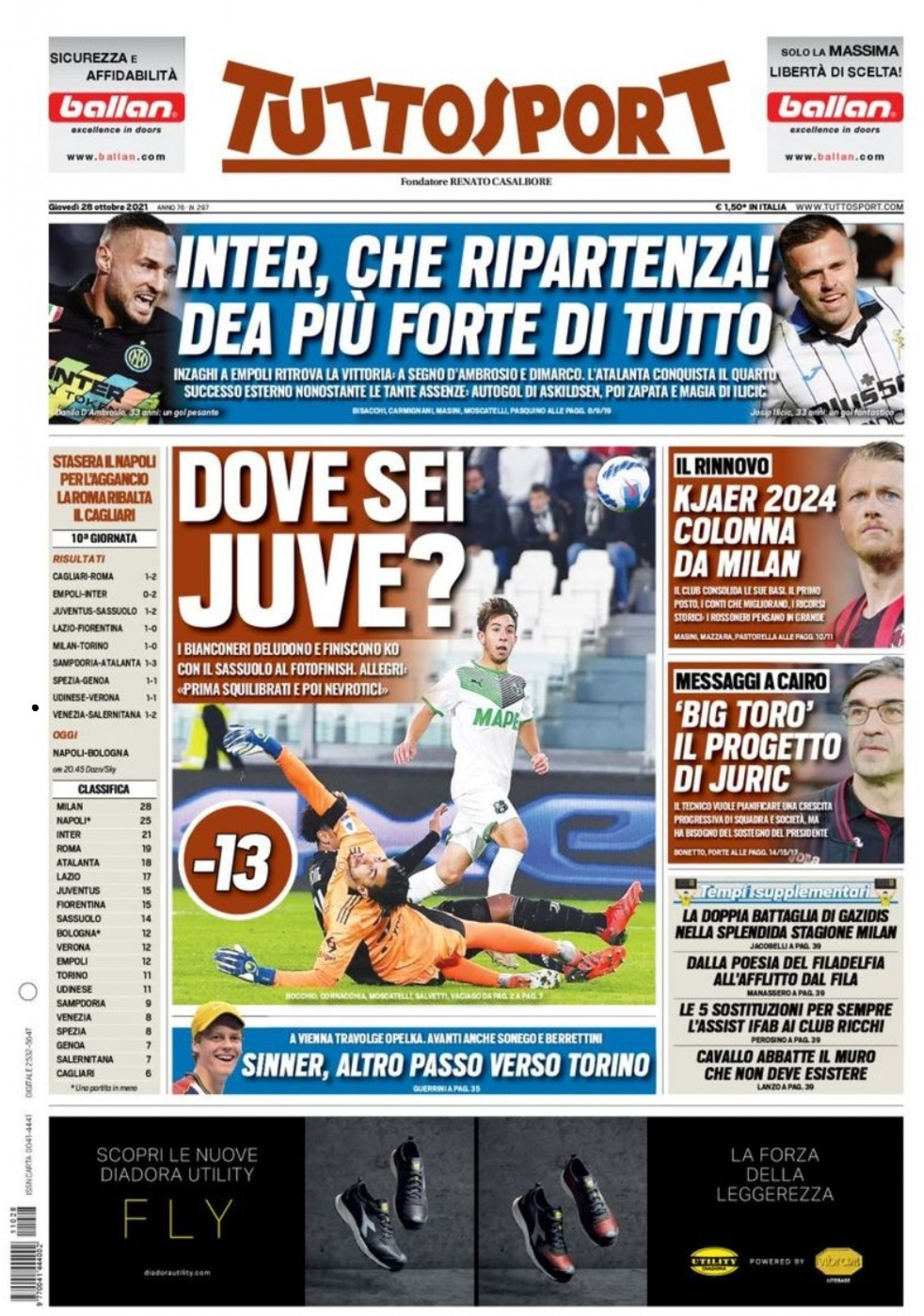 "Dove sei Juve?", questo il titolo in prima pagina di Tuttosport nell'edizione di oggi. "I bianconeri deludono e finiscono ko con il Sassuolo al fotofinish. Allegri: 'Prima squilibrati e poi nevrotici'". In taglio alto spazio agli altri risultato del turno infrasettimanale di Serie A: "Inter, che ripartenza! Dea più forte di tutto". Di spalla spazio ad un rinnovo in casa Milan: "Kjaer 2024: colonna da Milan".