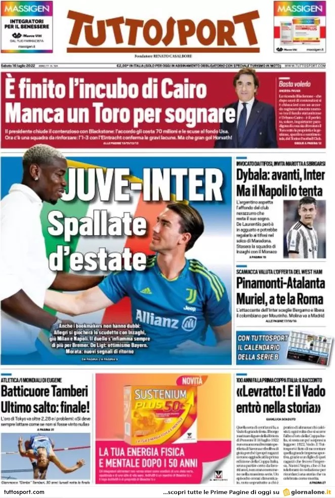 Tuttosport, nell'edizione di oggi, di spalla in prima pagina parla del futuro di Paulo Dybala che resta un rebus: "Dybala: avanti, Inter. Ma il Napoli lo tenta. L'argentino aspetta l'affondo del club nerazzurro che resta il suo sogno. De Laurentiis però è in agguato e potrebbe regalarlo ai tifosi nel segno di Maradona". A centro pagina spazio al duello Juve-Inter: "Spallate d'estate". In taglio alto spazio al Torino: "E' finito l'incubo di Cairo. Manca un Toro per sognare".