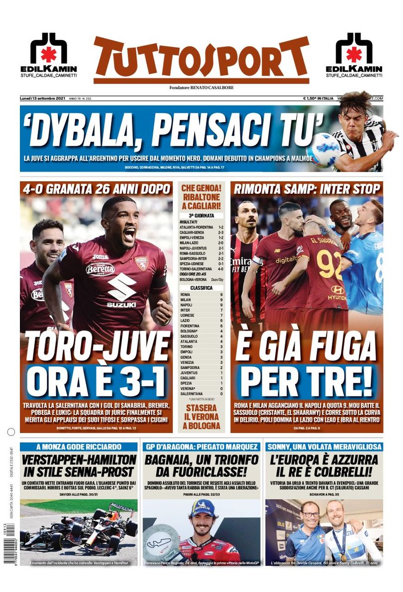 "E' già fuga per tre!", titola così in prima pagina Tuttosport, nell'edizione di oggi. "Roma e Milan agganciano il Napoli a quota 9. Mou batte il Sassuolo e corre sotto la Curva in delirio". In taglio alto spazio alla Juventus: "Dybala, pesaci tu. La Juve si aggrappa all'argentino per uscire dal momento nero. Domani debutto in Champions a Malmoe".