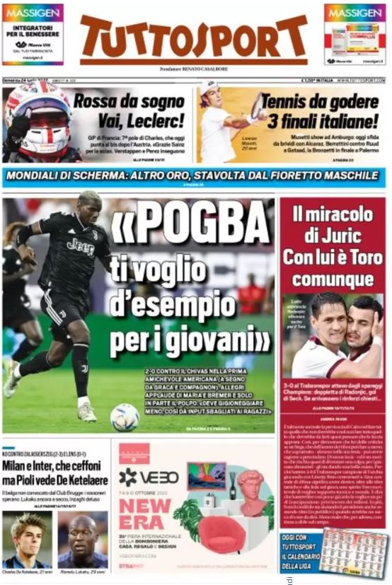 "Pogba, ti voglio d'esempio per i giovani". E' questo il titolo di Tuttosport, in riferimento alle parole di Massimiliano Allegri su Paul Pogba. In taglio basso anche le altre big di A: "Milan e Inter, che ceffoni ma Pioli vede De Ketelaere".