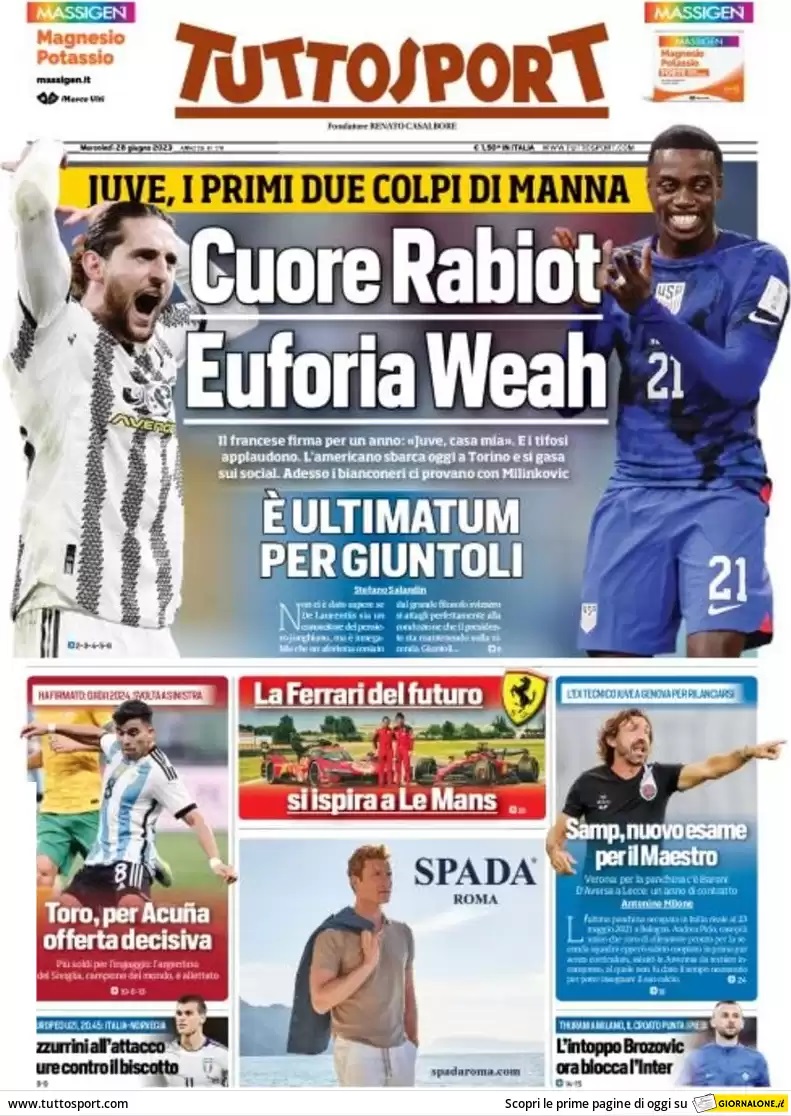 “E' ultimatum per Giuntoli", titola così Tuttosport in prima pagina nell'edizione odierna. In apertura spazio al mercato delle Juventus: "Cuore Rabiot. Euforia Weah". Di spalla spazio alla nuova avventura di Andrea Pirlo: "Samp, nuovo esame per il Maestro".
