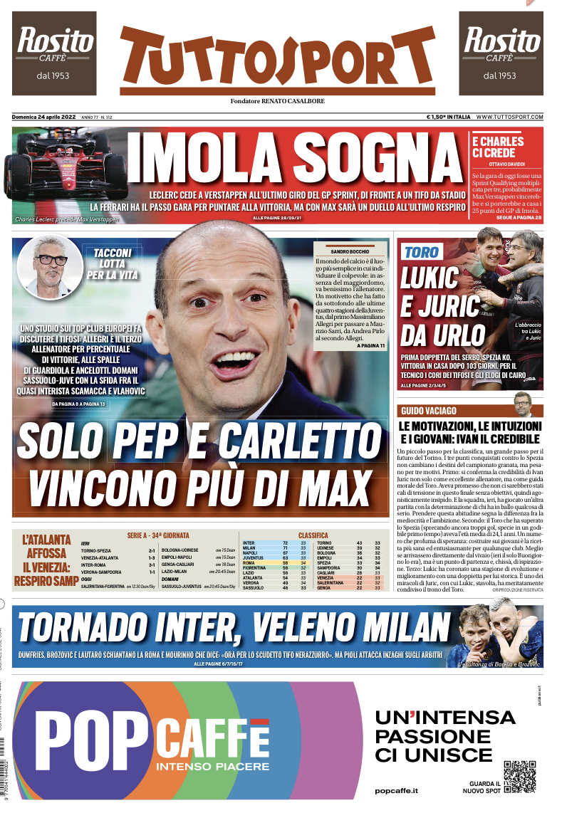 "Solo Pep e Carletto vincono più di Max". Questo il titolo in prima pagina dell'edizione odierna di Tuttosport. Fa discutere i tifosi uno studio statistico che vedrebbe il tecnico della Juventus Massimiliano Allegri secondo soltanto a Pep Guardiola e Carlo Ancelotti come percentuali di partite vinte. Intanto domani sera i bianconeri saranno ospiti del Sassuolo.