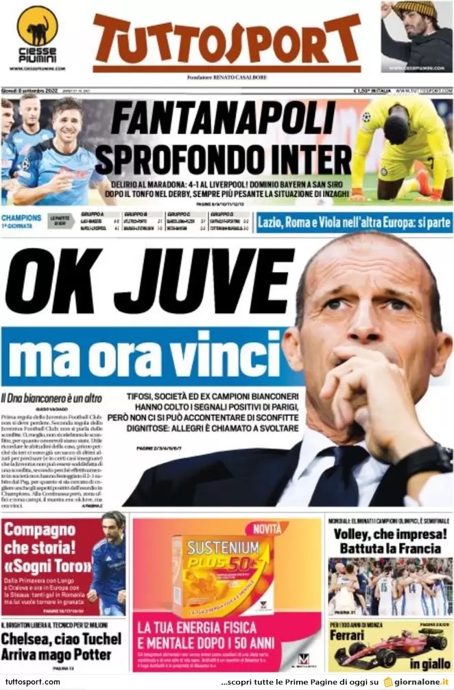"FantaNapoli. Sprofondo Inter", questa l'apertura in prima pagina di Tuttosport nell'edizione di oggi. "Delirio al Maradona: 4-1 al Liverpool. Dominio Bayern a San Siro dopo il tonfo nel derby, sempre più pesante la situazione di Inzaghi". A centro pagina spazio alla Juventus: "Ok Juve, ma ora vinci". A centro pagina l'esordio delle italiane in Europa e Conference League: "Lazio, Roma e Viola nell'altra Europa: si parte".