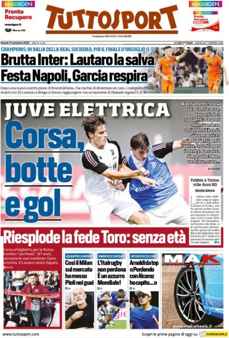 Tuttosport, nell'edizione di oggi, dedica il taglio alto in prima pagina a Napoli e Inter, rispettivamente una vittoria e un pareggio all'esordio in Champions: "Brutta Inter: Lautaro la salva. Festa Napoli, Garcia respira". In apertura spazio alla Juventus che si allena in vista del campionato: "Corsa, botte e gol". In taglio basso spazio al Torino: "Riesplode la fede Toro: senza età".