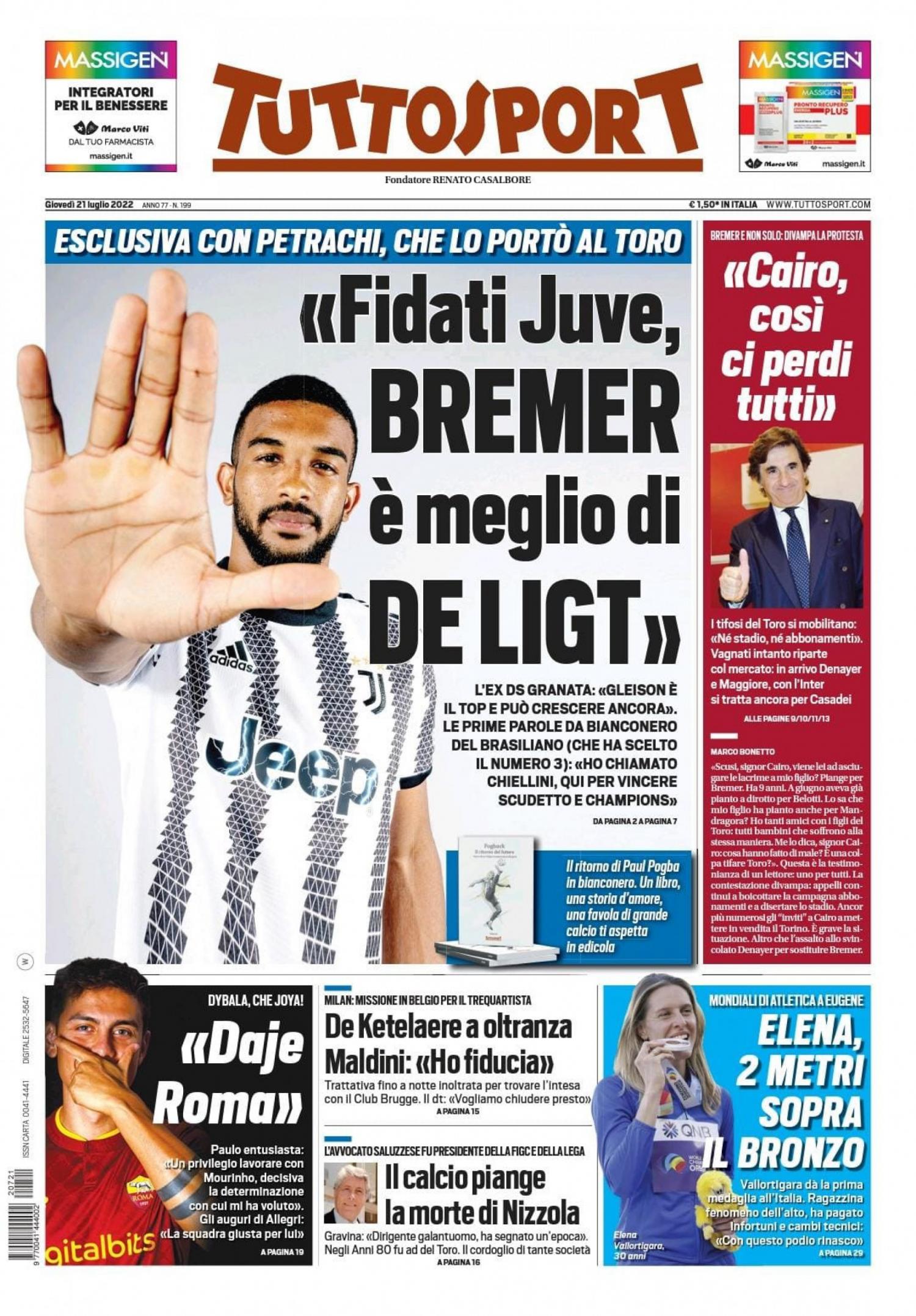 Nell'edizione odierna Tuttosport apre in prima pagina con le parole dell'ex ds del Torino Petrachi: "Fidati Juve, Bremer è meglio di De Ligt". A centro pagina spazio al mercato del Milan: "De Ketelaere a oltranza, Maldini: 'Ho fiducia'". Di spalla le prime parole da giallorosso di Paulo Dybala: "Daje Roma".